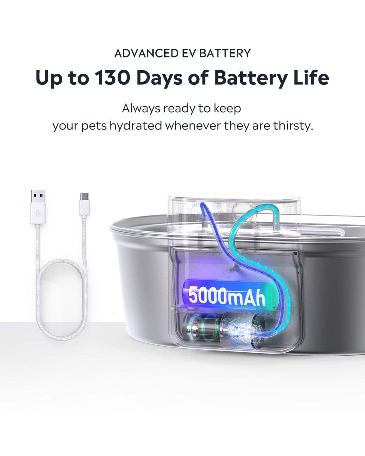 It won't ever disappoint your pet. With up to 130 days of battery life on a single charge and rechargeable via Type-C cable, this water fountain is always prepared to keep your pets hydrated whenever they're thirsty.