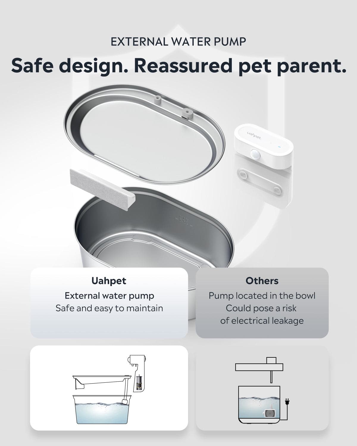 No pump in the bowl. Just the external water pump for easy setup, cleaning, and electrical leak-proof protection—keeping your furballs safe.