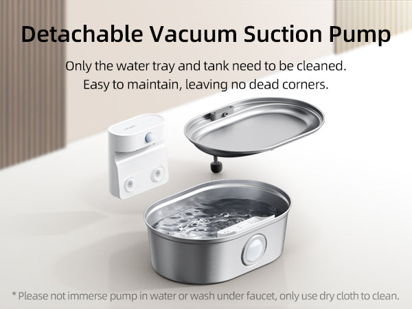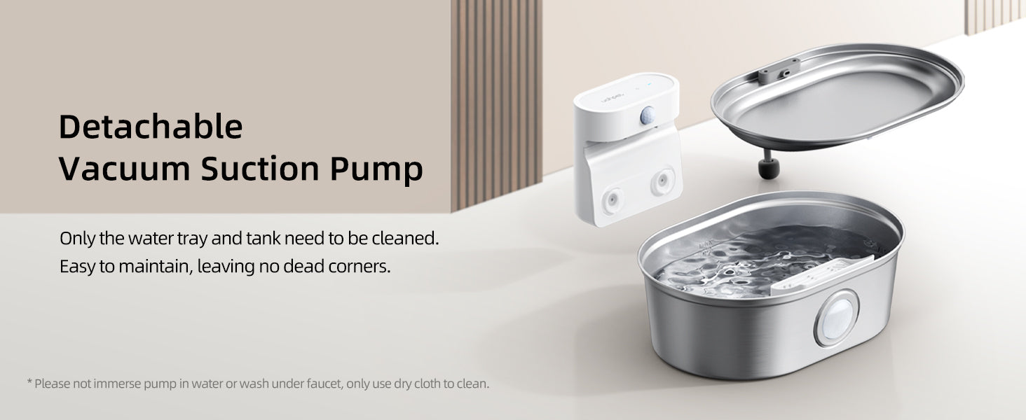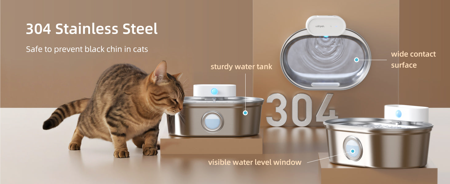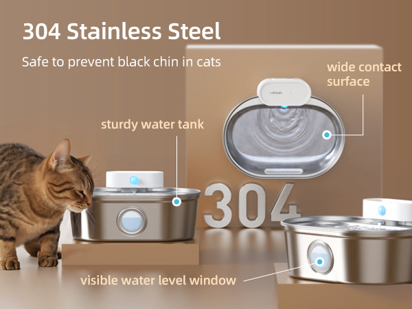The pet water fountain uses high-quality, food grade 304 stainless steel that's easy to clean and won't crack, not absorb odors. The wide, shallow tray avoid your cat's whiskers touching the edges and provides a 320ml capacity that avoids them drinking bottom dirty water.