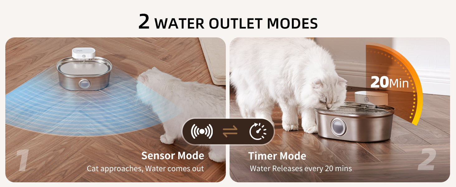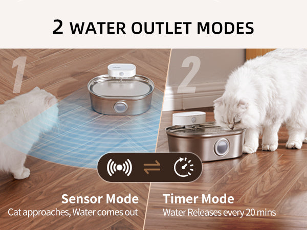 Automatic cat fountain senses pet's movement with a sensor, releasing fresh water when pets approach. Fresh flowing water encourages your cat to drink more and avoids dehydration and urinary problem. Also can switch to timed mode, releasing water every 20 mins for timid cats who prefer routine.