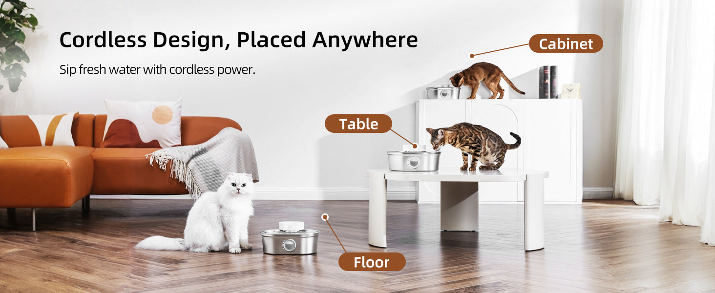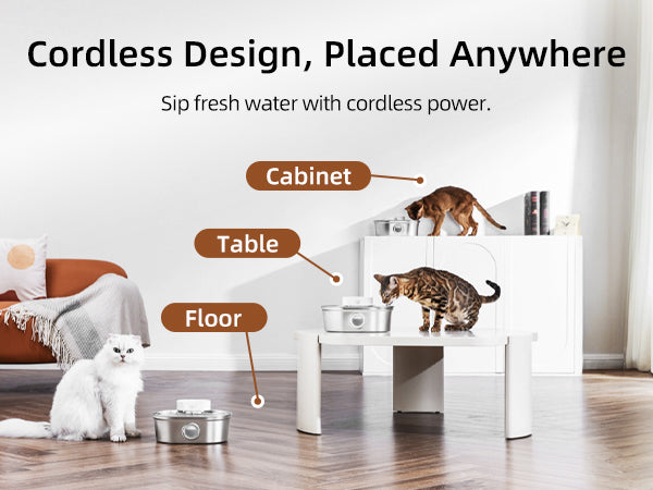 No wires required, the Uahpet cordless cat water fountain uses a large capacity rechargeable battery and can be placed anywhere, creating a quieter and more peaceful pet drinking environment, no need to worry about electric shocks, power outages, or running out of water while away.