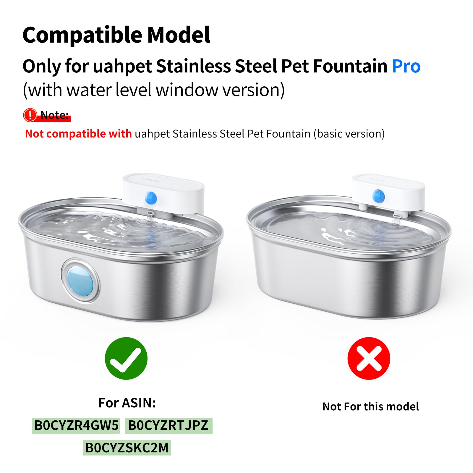 The pet water fountain uses high-quality, food grade 304 stainless steel that's easy to clean and won't crack, not absorb odors. The wide, shallow tray avoid your cat's whiskers touching the edges and provides a 320ml capacity that avoids them drinking bottom dirty water.